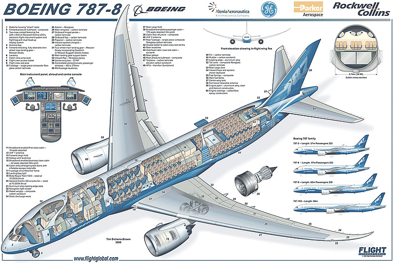 10. Flugzeughülle: Rumpf und Flügel bestehen nicht mehr aus Aluminium, sondern aus Kohlefaser, die leichter und stabiler ist. So braucht der Dreamliner 20 Prozent weniger Sprit als vergleichbare Flieger. |
