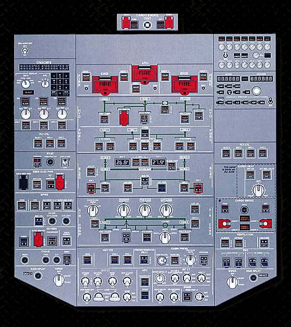 Overhead PanelHier können die Piloten alle Bordsysteme steuern und ablesen. Neben der Hydraulik befinden sich auf dem Overhead die Löschsysteme für die Triebwerke, die Stromversorgung, die Innen- und Außenbeleuchtung, die Klimaanlage und vieles mehr. |