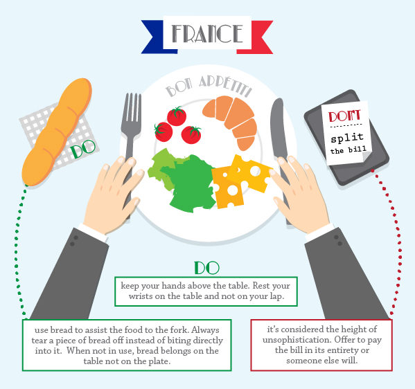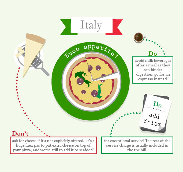 Die Italiener sehen Trinkgeld gerne, nicht aber dass Käse auf ein Gericht gestreut wird, das Meeresfrüchte enthält. Deshalb gilt: Käse nur über die Spaghetti streuen, wenn er vom Kellner explizit angeboten wird. Spaghetti sollte man am besten ganz und nur mit der Gabel essen. Kleinschneiden machen nur Kinder. Zudem trinken Italiener nach dem Essen einen Espresso schwarz.