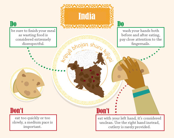 Der Kellner schaut Sie verständnislos an, wenn Sie Messer und Gabel verlangen? Das kommt daher, dass man hier mit den Händen isst. Aber Vorsicht: Nur mit der rechten Hand wird gegessen, die Linke gilt als dreckig. Aus diesem Grund benutzt man sie nicht zum Überreichen von Dingen.