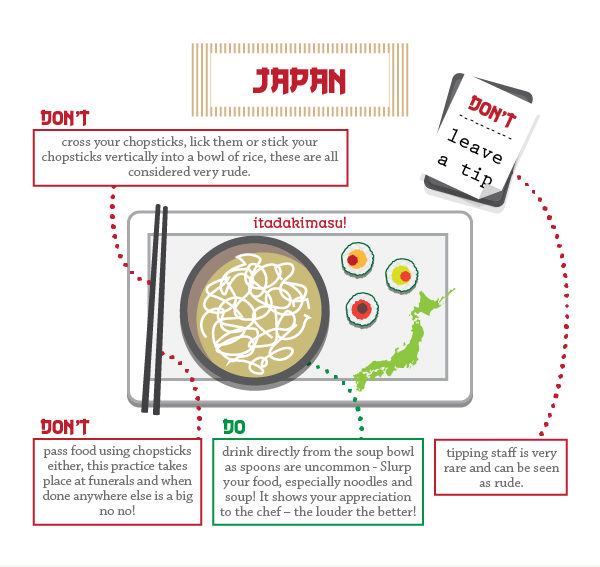 Sie sind verwundert, dass die Kellnerin wütend wird, wenn Sie ihr Trinkgeld geben? Das liegt daran, dass es in Japan als unhöflich gilt, Trinkgeld zu geben. Wie auch Chopsticks vertikal in den Reis zu stecken, damit Essen in einen anderen Teller weiterzugeben oder gar abzulecken. Was allerdings niemand stört, ist, direkt aus der Suppenschüssel zu trinken.