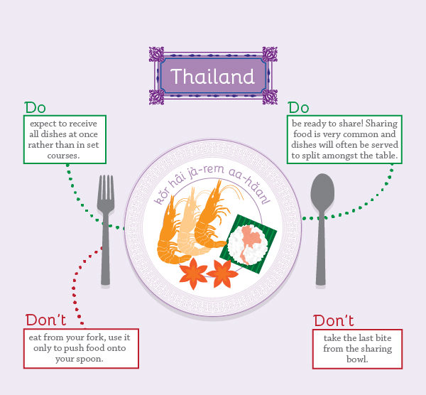 In Thailand isst man gerne zusammen und von allem: Deshalb sollten Sie sich nicht wundern, wenn der Hauptgang bereits mit der Vorspeisen serviert wird. Teilen ist hier erwünscht, den letzten Happen lässt man allerdings besser liegen. Zudem dient die Gabel hier nur, um Essen auf den Löffel zu schieben, die Gabel selbst sollte nie den Weg zum Mund finden.