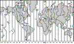 Die Hauptzeitzonen teilen die Welt in Segmente, die jeweils die gleiche Uhrzeit haben. Die USA haben vier Zonen für das Kontinentalgebiet (ohne Alaska), die von der Eastern Standard Time (sechs Stunden hinter der Mitteleuropäischen Zeit [MEZ] und fünf Stunden hinter der koordinierten Weltzeit UTC, die Greenwich Mean Time entspricht) bis zur Pacific Standard Time (neun Stunden hinter MEZ beziehungsweise acht Stunden hinter UTC) reichen. Ein paar Länder bringen allerdings Verwirrung in die Sache, indem sie mit ihren Zonen nur um eine halbe Stunde beziehungsweise um 45 Minuten abweichen. Venezuela beispielsweise liegt 4¼ Stunden hinter UTC, während Nepal 5¾ Stunden voraus ist. Wenn die Zeitzonen als gleichmässige Segmente wie die Spalten einer Orange aufgeteilt wären, würde nach jeweils 15 Längengraden eine neue Zeitzone beginnen. Doch in Wirklichkeit verlaufen die Grenzen in Schlangenlinien mit vielen Windungen von Pol zu Pol.