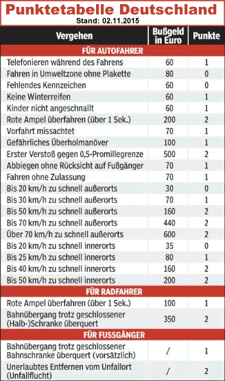 Links zu Bussgeldkataloge / BussgeldrechnerBlitzer Methoden und TippsSprache: ![]() Bussen-Übersicht für Europa Sprache: ![]() Bussgeldkatalog Deutschland Sprache: ![]() Bussgeldkatalog Deutschland Sprache: ![]() Bussgeldkatalog Deutschland Sprache: ![]() Bussgeldkatalog Deutschland Sprache: ![]() Bussgeldkatalog Deutschland Sprache: ![]() Bussgeldkatalog Deutschland Sprache: ![]() Bussenliste für die Schweiz Sprache: ![]() Bussgeldkatalog Schweiz Sprache: ![]() Bussgeldrechner für Deutschland Sprache: ![]() | ||