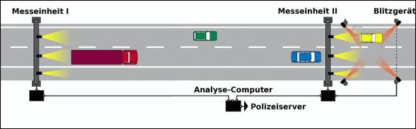 Vor dem Eingang des Arisdorftunnels auf der A2 im Kanton Baselland (Schweiz) erfasst ein Laserscanner jedes Fahrzeug und stellt fest, ob es sich um ein Auto oder um einen Lastwagen handelt. Anschliessend fotografiert eine Kamera mit unsichtbarem Infrarotblitz das Nummernschild. Das Kennzeichen wird zusammen mit der genauen Zeit und der Art des Fahrzeugs gespeichert. Am Ausgang des Tunnels tut eine identische Anlage dasselbe. Daraufhin übermitteln beide Messpunkte ihre Daten an einen Computer, der daraus die Dauer der Durchfahrt und damit das Durchschnittstempo des Fahrzeugs berechnet. Ist das Tempolimit überschritten, schiesst das Blitzgerät ein Foto, um den Fahrer zu identifizieren, und leitet die Daten an die Polizei weiter. Ist das Fahrzeug korrekt gefahren, werden die Aufzeichnungen sofort wieder gelöscht.