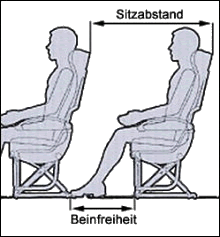 Sowohl für Sitzbreite als auch Beinfreiheit gilt: Je mehr desto bequemer. Die Sitzfläche eines Standardsitzes, gemessen zwischen den beiden Armlehnen, ist rund 44 Zentimeter breit. Der Abstand zwischen zwei Sitzen beträgt standardmässig rund 80 Zentimeter. Das entspricht nicht der Beinfreiheit sondern dem Abstand zwischen zwei identischen Punkten auf zwei hintereinander liegenden Sitzen.