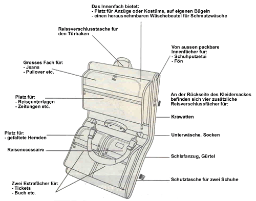 - Für Kurzreisen eignen sich Kleidersäcke, in die Anzüge, Hemden, Blusen oder Kostüme hineingehängt werden.