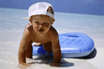 Auch solltest du darauf achten, dass ein wenig Abstand zum Meer besteht. Denn so schnell kannst du gar nicht schauen, ist dein Baby krabbelnderweise davon gezischt und wirft sich in die Fluten. Du kannst natürlich deinem Kind auch rein vorsorglich Schwimmflügelchen anlegen, damit ein gewisser Schutz vor dem Untergehen gegeben ist. Wahrscheinlich wird sich dein Kind aber nach dem ersten Kontakt mit dem Meer schnell wieder zurückziehen wollen, da Babys üblicherweise Badetemperaturen um 30 bis 34 Grad Celsius am meisten schätzen. Das Meer ist da einfach zu kalt. Ausserdem brennt das Salzwasser bei unabsichtlichem Kontakt mit den Augen. Gemeinsames Planschen, die Füsschen nass werden lassen oder sich ein bisschen von der Welle anspülen lassen, ist meist schon das höchste der Gefühle.